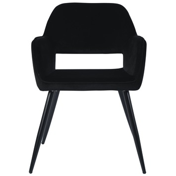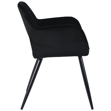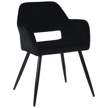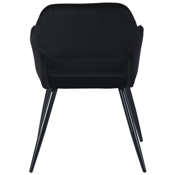 Eetkamerstoel Vera is gestoffeerd in een zwarte fluweel polyester stoffering met een vier metalen poten. De stoel heeft een unieke luxe uitstraling en staat leuk in meerdere ruimtes in het huis. De stoel heeft een rechthoekige gevormde zitting die heerlijk zit. Eetkamerstoel Vera is leuk te combineren met andere stoelen.