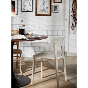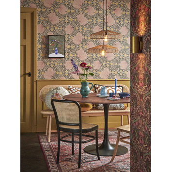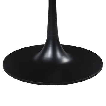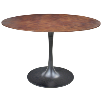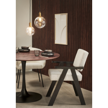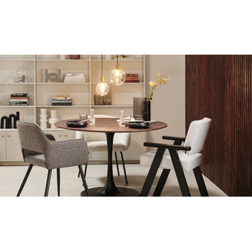 De eettafel Dene eettafel heeft een stijlvol ontwerp met sierlijke ronde vormen. Door deze ronde vorm en de trompetvoet is er veel ruimte om om de tafel te zitten. Het houten tafelblad geeft de eettafel een warme uitstraling.