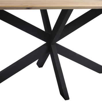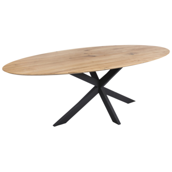 De eettafel Merlijn bestaat uit een metalen kruispoot met een ovaal eiken houten blad. De robuuste kruispoot geeft de tafel een stoere industriële uitstraling. Een echte blikvanger in huis.