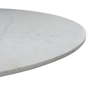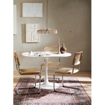 De eettafel Dene eettafel heeft een stijlvol ontwerp met sierlijke ronde vormen. Door deze ronde vorm en de trompetvoet is er veel ruimte om om de tafel te zitten. Het marmeren tafelblad geeft de eettafel een elegante uitstraling. Marmer is een natuurproduct, daar zal de uitstraling en patroon en oneffenheden af kunnen wijken van de getoonde afbeelding.