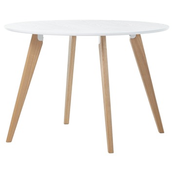- Met MDF wit gelakt rond tafelblad en blank gelakte essenhouten poten