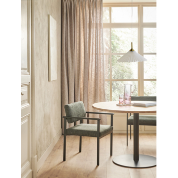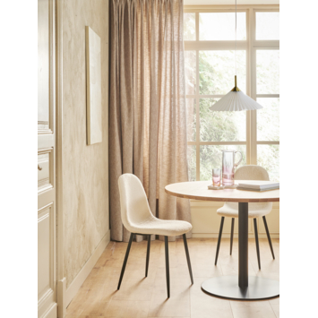 De eettafel Merlijn bestaat uit een metalen rechte poot met een ronde eiken houten blad. Door deze ronde vorm is er veel ruimte om gezellig rond de tafel te zitten De slanke poot geeft de tafel een subtiele uitstraling. Een echte blikvanger in huis.
