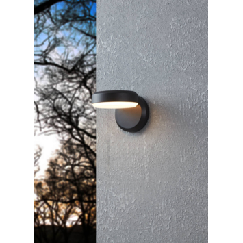 De FORNACI outdoor LED wandlamp bestaat uit een ronde muurplaat van zwart metaal en een lampbehuizing die ook rond is. De geïntegreerde LED's achter het naar beneden gerichte witte kunststof lichtoppervlak stralen een aangenaam, warm wit licht uit. Het armatuur is beschermd tegen stof en spatwater (IP54), zodat het zonder angst buiten kan worden gebruikt. Dankzij het eenvoudige ontwerp past deze buitenarmatuur in elke buitenruimte, of het nu direct bij de ingang van het huis of op het terras is.