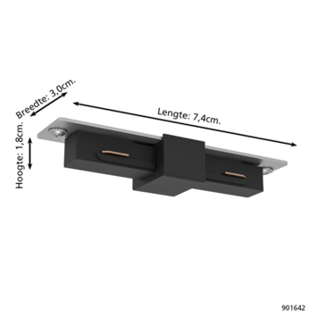 De connector is uitgevoerd in zwart kunststof en heeft een eenvoudig en strak ontwerp dat goed aansluit bij de overige onderdelen van het systeem. Dankzij deze neutrale uitstraling integreert het koppelstuk moeiteloos binnen moderne interieurs en blijft de lichtlijn mooi strak en doorlopend.