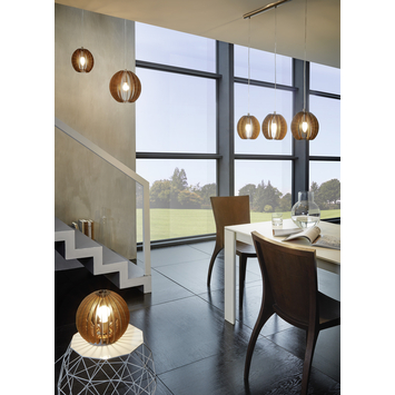 De Eglo Cossano hanglamp is speciaal ontworpen voor gebruik met de E27 lichtbron. Deze hanglamp wordt gekenmerkt door een bijzondere lampenkap vervaardigd uit geperst hout. De lampenkap heeft een gebogen vorm met doorschijnende delen, wat een speels effect in de ruimte creëert. In een combinatie van bruine en mat nikkel kleurige details straalt de hanglamp elegantie uit. Je kunt de lengte van de hanglamp aanpassen naar wens. De lampenkap heeft een diameter van 30 cm.