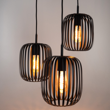 Ontdek de Romazzina ronde hanglamp, een prachtig ontwerp bestaande uit drie ronde lampenkappen vervaardigd van platte metalen strips in een zwarte kleur. Deze unieke lampenkappen zweven op verschillende hoogtes aan een elegant zwart textiel snoer, wat een speels en dynamisch effect creëert. De metalen strips werpen boeiende patronen van licht en schaduw op de omringende oppervlakken zodra de lamp wordt ingeschakeld. Met zijn zachte, ballonvormige lampenkappen is de Romazzina hanglamp een tijdloze toevoeging aan moderne interieurs. Of het nu boven een keukeneiland, in de woonkamer, of boven een lange eettafel hangt, deze lamp biedt een eigentijds designaccent voor elke ruimte. Let op: de afgebeelde lichtbronnen zijn niet inbegrepen. De lamp is compatibel met E27 fittingen, waardoor je vrij bent om je favoriete lampen te kiezen die passen bij je stijl en voorkeuren."