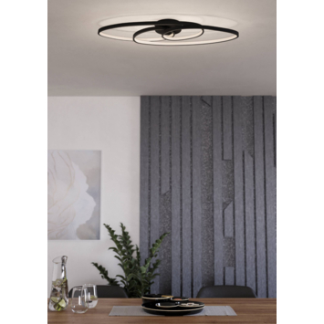 De plafondlamp GIANELLA-LED van zwart metaal heeft een gekruld verlichtingselement. De achter de witte plastic kapjes geïntegreerde LED’s hebben aangenaam warm wit licht. Door middel van een LED dimmer is de lichtintensiteit makkelijk aan te passen naar je eigen voorkeur. Dankzij het minimalistische ontwerp biedt deze plafondlamp moderne verlichting in elke ruimte, of het nu gaat om een keuken, woonkamer, slaapkamer, hal of eetkamer.