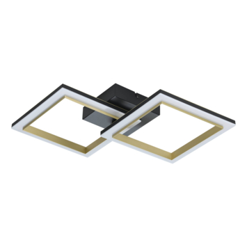 De Eglo plafondlamp Calliera LED van zwart metaal met messingkleurige accenten heeft twee vierkante verlichtingselementen van verschillende grootte. De achter de witte kunststof kapjes geïntegreerde LED's geven een aangenaam warm wit licht. Dankzij het minimalistische ontwerp biedt deze plafondlamp moderne verlichting in elke ruimte, of het nu gaat om een keuken, woonkamer, slaapkamer, hal of eetkamer.