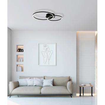 De plafondlamp PALMAVES 2 LED van zwart metaal heeft twee ronde verlichtingselementen van verschillende grootte. De achter de witte plastic kapjes geïntegreerde LED's geven een aangenaam warm wit licht. Dankzij het minimalistische ontwerp biedt deze plafondlamp moderne verlichting in elke ruimte, of het nu gaat om een keuken, woonkamer, slaapkamer, hal of eetkamer.