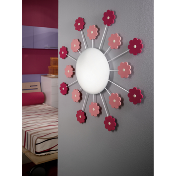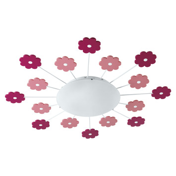 De Eglo plafondlamp Viki roze is een speelse plafonnière met een moderne uitstraling. De armatuur, gevormd door de glazen kern met daar omheen 16 roze bloemen, is ook geschikt voor wandmontage. Het hart van de bloemen geeft nog 15-20 minuten een beetje licht af.