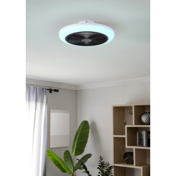 Met de EGLO ventilator met LED verlichting Sayulita in wit met zwarte accenten kies je voor een plafondventilator die een modern kleurcontrast combineert met multifunctionele eigenschappen. Deze ventilator heeft een diameter van 46 centimeter en past dankzij de combinatie van wit en zwart uitstekend in moderne en eigentijdse interieurs.