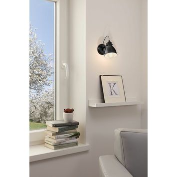 De Eglo wandlamp Priddy zwart is een mooi armatuur met een vintage uitstraling. Door het gebruik van zwart gelakt staal heeft de lamp een stoere degelijke industriële look. Deze wandspot combineren met een vintage led lamp met een spiraalfilament naar keuze zorgt voor een persoonlijke sfeer