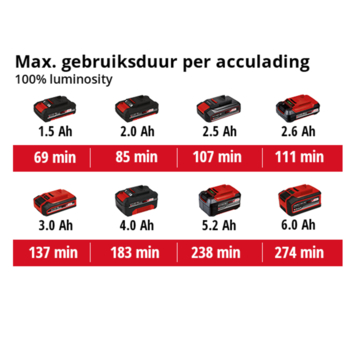 De Einhell accu Lamp TE-CL 18/2500 Li AC Solo brengt met 2.500 lumen veel licht in het donker.Als onderdeel van de Power X-Change-productlijn kunnen alle accu's met de lamp worden gecombineerd.De accu lamp is niet alleen praktisch op slecht verlichte plaatsen zoals in de kelder, de bouwplaats, op zolder of in donkere hoeken van de werkplaats.De handige accu lamp biedt voldoende licht, zelfs bij stroomuitval of tijdens een kampeervakantie, voor nachtwandelingen, voor wandelingen na zonsondergang en voor andere buitenactiviteiten als u niet zonder stroomonafhankelijke lichtbron op pad wilt gaan.Dankzij de zeven duurzame, heldere leds met een totale lichtstroom van 2.500 lumen en 6.500 K(elvin) kleurtemparetuur is de accu lamp niet alleen helderder, maar ook robuuster en minder gevoelig voor stoten dan een vergelijkbare halogeenlamp.Twee helderheidsniveaus zorgen voor een ideale verlichting.Een statiefbevestiging is mogelijk door de 1/4"-schroefdraad.De lamp is gemakkelijk te hanteren en flexibel in gebruik dankzij het slanke, lichte ontwerp en de ergonomische handgreep met softgrip.De levering is exclusief accu en oplader uit de Power X-Change productlijn; deze zijn los verkrijgbaar, bijvoorbeeld als praktische starter kit in verschillende sterktes.