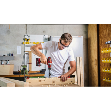 De Einhell accu Boor-/Schroefmachine TE-CD 18/40-1 Li Kit is een krachtige machine uit de flexibele Power X-Change productlijn. De accu boor-/schroefmachine heeft een robuuste tandwiel aandrijving met 2 versnellingen voor krachtig boren en schroeven, maar ondanks al zijn kracht zorgt de elektronische snelheidsregeling met 21 aandraaimomenten ervoor dat de boor-/schroefmachine steeds kan worden aangepast aan het specifieke materiaal en de toepassing. De eenhulzige snelspanboorkop van 13 mm maakt het eenvoudig om boren en bits te plaatsen in de boorkop. Uitzonderlijk eenvoudige bediening en een stevige, veilige grip worden geboden door het ergonomische ontwerp en de softgrip. Voor optimale zichtbaarheid in het werkgebied is er een geïntegreerde LED-lamp. De Boor-/schroefmachine wordt geleverd inclusief 2x 1.5 Ah Power X-Change accu en een 30-minuten oplader. De PXC accu's kunnen niet alleen flexibel worden gecombineerd met iedere machine uit de Power X-Change productlijn, ze zijn ook op ieder moment klaar voor gebruik dankzij de hoogwaardige lithium-ion accuceltechnologie zonder zelfontlading. De boor-/schroefmachine wordt geleverd in een praktische transport-/opbergkoffer.