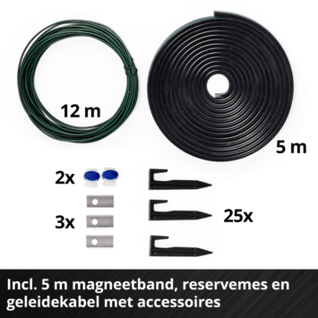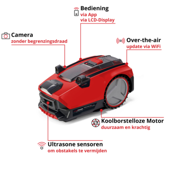De magneetsensoren in de FREELEXO CAM herkennen de magneetband, zodat de robotmaaier zich aan de rand van de magneetband omdraait. Zo kun je gebieden afbakenen die tijdelijk niet gemaaid mogen worden, zoals een pas geplante boom of een bloemenweide. De FREELEXO CAM PLUS kan worden bediend via WiFi dankzij de Einhell Connect app of via een LCD-scherm met een intuïtief toetsenbord. De maaitijden kunnen bijvoorbeeld op de exacte dag worden geprogrammeerd. Om ervoor te zorgen dat de robotmaaier altijd up-to-date is, worden de updates draadloos uitgevoerd, zonder een extra USB-stick via WLAN. De robotmaaier is beveiligd tegen diefstal dankzij een PIN-code en een waarschuwingssignaal. De terugkeer naar het laadstation en het oplaadproces gebeuren automatisch. Ook is er een geïntegreerde regensensor. De robotmaaier heeft een maaihoogte-instelling van 20-60 mm en is geschikt voor hellingen tot 25%. De draaghandgreep zorgt voor comfortabel transport. De FREELEXO CAM PLUS 600 wordt geleverd met alles wat je nodig hebt voor installatie en gebruik. Aanbevolen voor gazons tot 600 m². Bij levering inbegrepen zijn een 4.0 Ah accu, een laadstation, 3 reservemessen, geleidedraad van 12 m, magneetband van 5 m, 25 bevestigingshaken en 2 verbindingsklemmen.