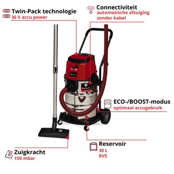 - Robuuste roestvrijstalen bak: 30 liter capaciteit voor zowel droog vuil als vloeistoffen