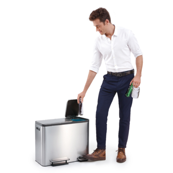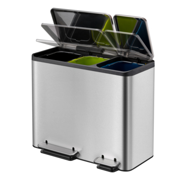 De EKO EcoCasa Pedaalemmer 15+15+15L is een rechthoekige pedaalemmer van geborsteld RVS met fingerprint proof coating en handige kunststof handgrepen. Voorzien van gedempt sluitende deksels. De twee pedalen geven afzonderlijk toegang tot de kunststof binnenemmers (2x 15 + 1x 15 liter) voor het scheiden van afval. De stay-open functie vergrendelt het deksel, voor het makkelijk schoonmaken van de afvalbak of wisselen van de afvalzak.