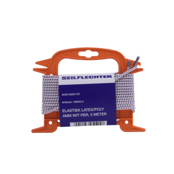 Elastiek, geproduceerd door Seilflechter is wit met en blauw/rode markering en heeft een diameter van 4mm met een lengte van 5mtr. De kern is vervaardigd van hoogwaardig latex met een polyester gevlochten mantel. Het elastiek is UV bestendig, heeft een rek van 130% en is gewikkeld op een herbruikbare haspel.
