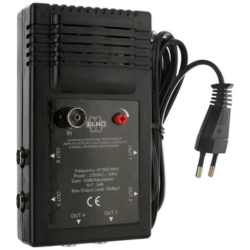 Deze ELRO Antenneversterker AN406S Zwart 6 Uitgangen bevat maar liefst 6 regelbare uitgangen en voorkomt storing/ ruis door een verzwakt signaal. Het signaal kan tot maximaal 10 decibel worden versterkt. De versterker is voorzien van een ingebouwde voeding en is te gebruiken bij een kabellengte langer dan 20 meter.