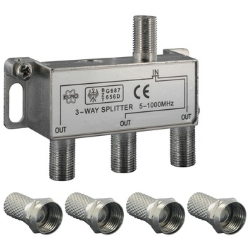 ELRO coax 3-weg splitter AN304S inclusief 4 F-connectoren, voor het splitsen van een antennesignaal. De splitter heeft een goede afscherming tegen stoorsignalen tot 90 decibel. Door het gebruik van F-connectoren wordt signaalverlies beperkt. De splitter is geschikt voor wandmontage.