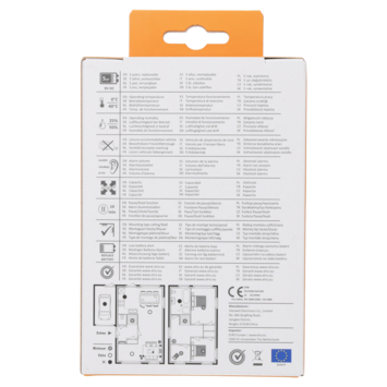 In de doos vind je de Elro FS1705 rookmelder, een 9V batterij en het bevestigingsmateriaal. Deze optische rookmelder voldoet aan de Europese norm EN 14604 en heeft een batterij met een levensduur van ongeveer vijf jaar.