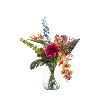 Haal de exotische sferen in huis met dit boeket van Emerald! Het boeket bevat prachtige exotische bloemen en bladeren. Deze zijn voorzien van de fijnste details. Het is ons doel om alle producten zo natuurlijk mogelijk weer te geven. Het fijne is dat dit boeket geen water nodig heeft en het hele jaar door zijn kleur en vorm behoudt.