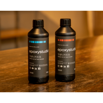 Epoxystudio giethars "thin pour" is een heldere epoxyhars, speciaal ontworpen voor het gieten van dunne lagen. Deze giethars wordt vaak gebruikt voor het gieten van kleine objecten en het vullen van knoesten en nerven. De set van 1,6 kg bestaat uit twee componenten: hars en harder, die gemengd worden in een verhouding van 100:60 op gewicht. Na het mengen begint de epoxy uit te harden, met een droogtijd van 12-18 uur voor de eerste laag. Volledig uitharden duurt ongeveer 3-5 dagen. Voor het verwijderen van luchtbelletjes kan Epoxystudio bellenspray worden gebruikt.