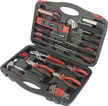De Erro gereedschapsset in koffer 55-delig is een goed gevulde gereedschapsset met de meest gebruikte gereedschappen in een handige koffer. De set bestaat uit de volgende onderdelen: 1 hobbymes, 6 reservemesjes, 1 mini waterpas, 6 schroevendraaiers, 1 bithouder schroevendraaier, 1 moersleutel, 1 waterpomptang, 1 telefoontang, 1 zijsnijtang, 1 combinatietang, 1 rolmaat van 3 meter, 1 klauwhamer, 20 bitjes (platkop, kruiskop en torx) en 9 inbussleutels, 2 houders voor de bitjes en een houder voor de inbussleutels. Alles zit handig in één koffer zodat je al je gereedschap altijd netjes bij de hand hebt.