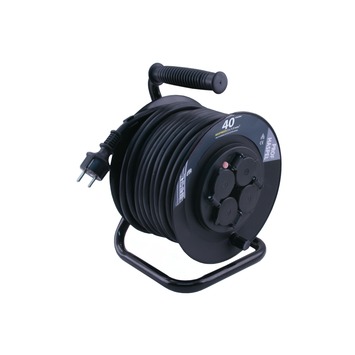 ETM kabelhaspel professioneel zwart, met 4 stopcontacten met randaarde en een 40 meter lange 3x 1,5 mm2 neopreen-snoer, is ideaal voor het aansluiten van elektrische apparaten waarvan het snoer niet toereikend is tot het stopcontact. Met een belastbaar vermogen tot 3000 watt kun je meerdere elektrische apparaten op deze kabelhaspel aansluiten. De kabelhaspel is beveiligd tegen overbelasting. Met behulp van de stevige handgreep is het snoer eenvoudig op- en uit te rollen. De kabelhaspel is spatwaterdicht (beschermingsklasse IP44), dus ook geschikt voor buitengebruik.