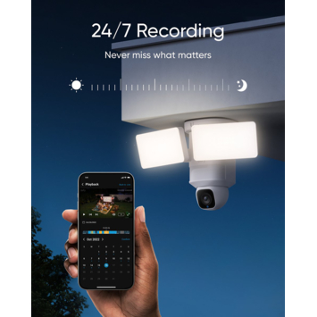 De Eufy E30 solocam floodlight zorgt voor volledige controle over wat er rond je huis gebeurt. Met een draaibereik van 360° en een kanteling van 70° hou je elke hoek in de gaten. De camera kan automatisch patrouilleren op vaste tijden of handmatig worden bestuurd via de app. Zo bekijk je in een paar tikken je oprit, voortuin of zijgevel. Dankzij de 2.000 lumen LED-spotlights zie je alles haarscherp, zelfs in het donker.