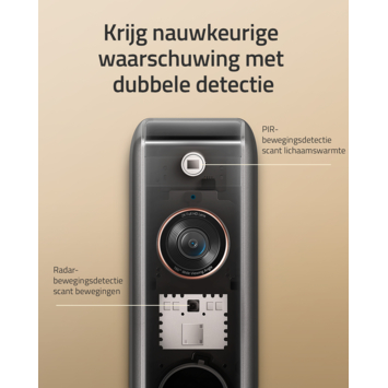 Video Doorbell Dual 2K met HDR Bewaking met Quad HD kan bezoekers aan de hand van de kleinste details identificeren. En dankzij het grote dynamische bereik zie je bezoekers met perfecte kleur en scherpte, ook als de zon achter ze staat. PD eufy Security Video Doorbell Dual (op batterijen) Van eufy, waar privacy voorop staat. De geavanceerde PIR- en radarbewegingssensoren kunnen zowel verre als nabije objecten onderscheiden en brengen het aantal valse alarmen met 95% terug.