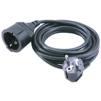 Exin verlengsnoer met randaarde zwart 5 meter, voor het aansluiten van een elektrisch apparaat waarvan het snoer niet toereikend is tot het stopcontact. Het 5 meter lange zwarte verlengsnoer heeft een belastbaar vermogen tot 2500 watt.