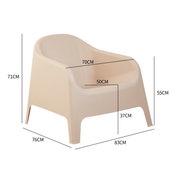 Zithoogte 37,5 cm, breedte 51 cm, diepte 48,5 cm, armleuningen 57 cm. Gemaakt van 50% gerecycled kunststof en kan tot 150 kg dragen. Lichtgewicht en eenvoudig te verplaatsen.