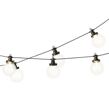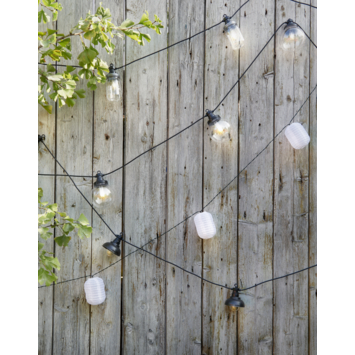Met deze leuke feestverlichting Jar aan een snoer creëer je een gezellige sfeer in je tuin, op het balkon, of gewoon binnen in jouw (slaap)-kamer. Deze bollen van deze verlichting hebben een ø van 10 cm. Ze hebben een beschermingsklasse van IP44 en zijn daarmee spatwaterdicht, zeer geschikt voor buiten. Het aanloopsnoer is 5 meter van de 9,5 meter totale lengte. De tussenruimte van de 10 lampjes bedraagt 50 cm. Hun warm witte licht maakt je (buiten)ruimte direct sfeervol. Deze verlichting zijn voorzien van LED lampen.