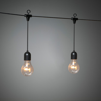 Maak een extra gezellig en sfeervol feestje van alle (buiten) activiteiten met dit trendy, decoratieve en energiezuinige feestverlichtingsnoer. Dit modieuze en duurzame LED lichtsnoer met 10 transparante bollen -elk met 8 extra warmwitte 2200K LED lichtbronnen- is 4.5 meter lang. De verlichte bollen hebben een hoge lichtoutput gedurende de hele levensduur en zijn verbonden aan de hoofdkabel met een verticaal snoertje van 40cm lengte. De afstand tussen de verticale snoeren is 50cm. De 8 LEDs per lichtbron zijn midden in de bol geplaatst voor maximale lichtspreiding. De bollen zijn van kunststof en dus niet breekbaar. De hoofdkabel is voorzien van ophangoogjes voor eenvoudige wand of plafondmontage. De kabelkleur is zwart. Het aansluitsnoer tot aan de eerste lichtbron is 10 meter lang, dus bijna altijd zonder verlengsnoer op een stopcontact aan te sluiten. Het snoer is zeer energiezuinig met een verbruik van slechts 3W en heeft energielabel A. Het snoer kan binnen en buiten worden gebruikt (IP44 rating tegen vocht en stof).