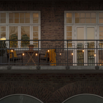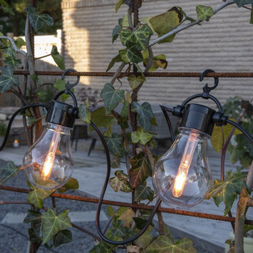 Maak een extra gezellig en sfeervol feestje met deze fantastische, in 4 standen dimbare Power LED feestverlichting. Een krachtig maar warm en sfeervol licht creeer je moeiteloos met dit trendy en zeer energiezuinige feestverlichtingsnoer. Dit semi professionele PowerLED lichtsnoer met 10 transparante bollen -elk met een dimbare en vervangbare extra warmwitte 2200K twin PowerLED lichtbron- is 4.5 meter lang. De verlichte bollen hebben een hoge lichtoutput gedurende de hele levensduur en zijn op 4 standen dimbaar (25%-50%-75%-100%). De kabel is een zwarte 24V kabel met een hoge trek en wringbelasting. De afstand tussen de lichtbronnen is 50cm. De PowerLED lichtbronnen zijn in het midden van de transparante bollen geplaatst voor maximale lichtspreiding. De bollen zijn van kunststof en dus niet breekbaar. Het aansluitsnoer tot aan de eerste lichtbron is 10 meter lang, dus bijna altijd zonder verlengsnoer op een stopcontact aan te sluiten. Het snoer is zeer energiezuinig met een verbruik van slechts 6W en heeft energielabel A. Het snoer kan binnen en buiten worden gebruikt (IP44 rating tegen vocht en stof). Het is niet geschikt voor gebruik in of onder water.