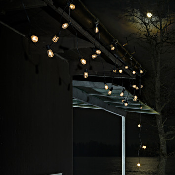 Maak een extra gezellig en sfeervol feestje van alle sociale activiteiten met dit trendy, decoratieve en energiezuinige feestverlichtingsnoer. Dit duurzame LED lichtsnoer met 20 transparante lampjes -elk met 2 warmwitte 2800K LED lichtbronnen- is 4.75 meter lang. De verlichte bolletjes met E14 schoeffitting hebben een hoge lichtoutput gedurende de hele levensduur. De afstand tussen de LED lampjes is 25cm. De 2 LEDs per lichtbron zijn midden in de bol geplaatst voor maximale lichtspreiding. De lampjes zijn van kunststof en dus niet breekbaar. De kabelkleur is zwart. Het aansluitsnoer tot aan de eerste lichtbron is ook nog eens 10 meter lang, dus het snoer is bijna altijd zonder verlengsnoer op een stopcontact aan te sluiten. Het snoer is energiezuinig met een verbruik van slechts 6W en heeft energielabel A. De ruime kabeldiameter garandeert een hoge trekbelasting. Het snoer kan binnen en buiten worden gebruikt (IP44 rating tegen vocht en stof).