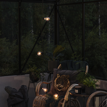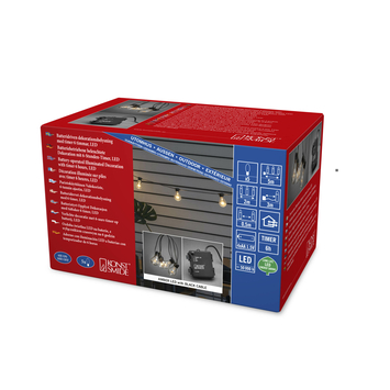 Breng je huis en tuin in een eenvoudig en snel in feestelijke stemming met dit 2 meter lange enenergiezuinige LED feestverlichting lichtsnoer met 6u timer. Het snoer werkt op batterijen en kan dus overal flexibel en zonder stroomaansluiting binnen of buiten worden toegepast. Dit lichtsnoer met een hoge lichtopbrengst gedurende de hele levensduur is een 2 meter lang zwart lichtsnoer met 5 transparante kunststof bollen, elk voorzien van 8 LEDs midden in de bol geplaatst voor maximale lichtspreiding. De afstand tussen de lichtbronnen is 50cm. De bollen zijn van kunststof en dus niet breekbaar. Het snoer heeft een batterijbox die zonder gereedschap geopend en gesloten kan worden en die corrosievrij is. Op de batterijbox is een schakelaar met 3 standen ingebouwd: 1=TIMER 6H / 2= on / 3 = OFF. Op stand 1 activeer je een 6-uurs timer: het snoer schakelt 6u in en vervolgens automatisch 18u uit. Dit is handig als het snoer buiten hangt. Op stand 2 schakel je het snoer permanent in, op stand 3 permanent uit. Het lichtsnoer werkt op 4x AA/LR6 batterijen (niet meegeleverd). De batterij box is spatwater en stofdicht (IP44) en geschikt voor binnen- en buitengebruik. Niet geschikt voor gebruik in of onder water. Het aansluitsnoer van batterijbox tot aan de eerste lichtbron is 3 meter lang.