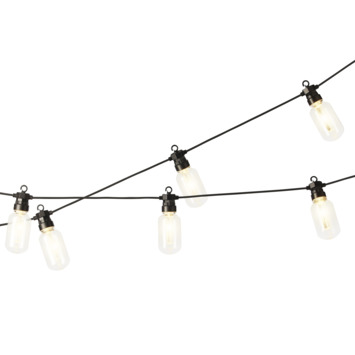 Met deze leuke feestverlichting Mason aan een snoer creëer je een gezellige sfeer in je tuin, op het balkon, of gewoon binnen in jouw (slaap)-kamer. Ze hebben een beschermingsklasse van IP44 en zijn daarmee spatwaterdicht, zeer geschikt voor buiten. Het aanloopsnoer is 5 meter van de 9,5 meter totale lengte. De tussenruimte van de 10 lampjes bedraagt 50 cm. Hun warm witte licht maakt je (buiten)ruimte direct sfeervol. Deze verlichting zijn voorzien van LED lampen.