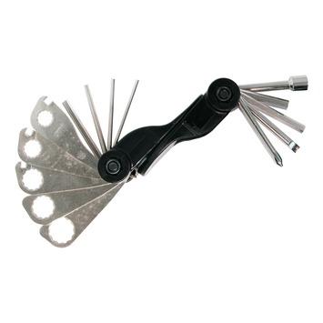 De Fietsgereedschapset 19-delig is een compacte 19-delige set dat speciaal ontwikkeld is voor reparaties en onderhoud aan de fiets onderweg. Doordat de Fietsgereedschapset 19-delig compact is, is het makkelijk mee te nemen en op te bergen tijdens het fietsen, trektochten of vakanties. De set bestaat uit de inbussleutels 2-2,5-3-4-5-6 millimeter, schroevendraaiers plat 5 millimeter, kruiskop 2 millimeter, ringsleutels: 8-9-10-13-15 millimeter, 2 bandenlichters, spaakspanners 0.136''-14-15 GE en een dopsleutel van 8 millimeter.
