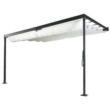 Het Firenze muurpaviljoen ecru is een luxe muurpaviljoen van 2.65 tot 2.20 meter hoog (aflopend), 3.90 meter breed en 2.90 meter diep. Het muurpaviljoen heeft een ecru kleurig doek en een stevige frame van hoogwaardig gepoedercoat aluminium. Dit paviljoen is dus echt de sfeermaker in je tuin. Doordat alle bevestigingsmaterialen van rvs zijn, zullen deze ook niet gaan roesten. Het doek van het paviljoen is zowel UV bestendig als schimmelwerend. Door middel van de bijgeleverde beschermingshoes kan je het muurpaviljoen beschermen tegen weersinvloeden als je hem even niet gebruikt. Het Firenze muurpaviljoen ecru zorgt er dus voor dat er een geweldige sfeer in je tuin wordt gecreëerd.