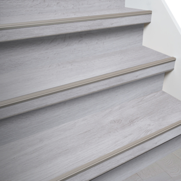 Met Firststep traprenovatie in de kleur grijs eiken bekleed je eenvoudig je trap in 1 dag. Om de trap te renoveren heb je traprenovatie-sets nodig en sets met trapneusprofielen.