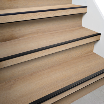 Met Firststep traprenovatie in de kleur naturel eiken bekleed je eenvoudig je trap in 1 dag. Om de trap te renoveren heb je traprenovatie-sets nodig en sets met trapneusprofielen.