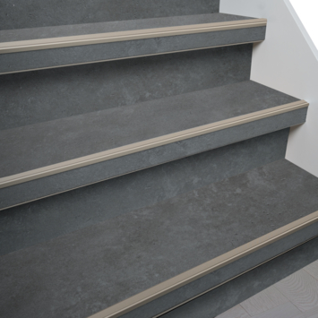 Met traprenovatie in de kleur steen antraciet bekleed je eenvoudig je trap in 1 dag. Om de trap te renoveren heb je traprenovatie-sets nodig en sets met trapneusprofielen.