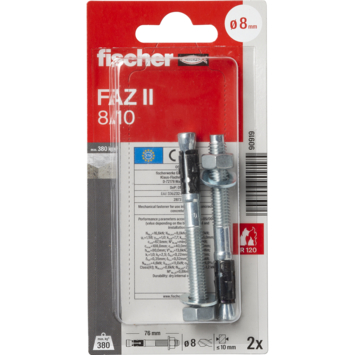 Fischer FAZ II 8/10 ankerbout 2 stuks zijn geschikt voor doorsteek- en voorsteekmontage. De ankerbout is 75mm. Gebruik voor het boren van een gat een boor van Ø8mm. Maximaal te belasten tot 240 kg afhankelijk van het soort materiaal. Te gebruiken voor stalen constructies, leuningen, ladders, hekwerk en trappen. Verpakt per 2 stuks.