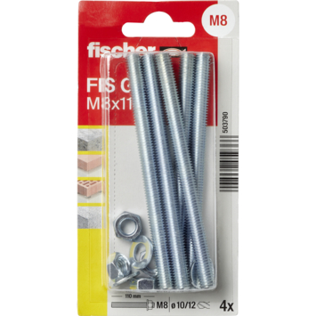 Fischer FIS GS M8x110 draadstang met onderlegring en moer 4 stuks zijn geschikt voor alle soorten bouwstoffen. Gebruik voor het boren van het gat een boor van Ø10mm. De draadstang is 110 mm. Geleverd als 4 draadstangen inclusief onderlegringen en moeren.