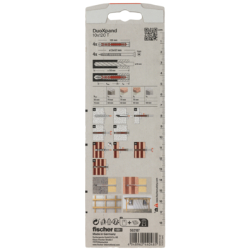 De fischer Constructieplug DuoXpand met dubbele verankeringsdiepte is gecertificeerd voor meervoudige bevestiging van niet-dragende systemen in beton, metselwerk én cellenbeton. Dankzij de speciale geometrie en het gebruik van verschillende kunststoffen, past de plug zich perfect aan de ondergrond aan. De DuoXpand met verzonken kop is zeer geschikt voor het bevestigen van houten aanbouwdelen in metselwerk of beton.