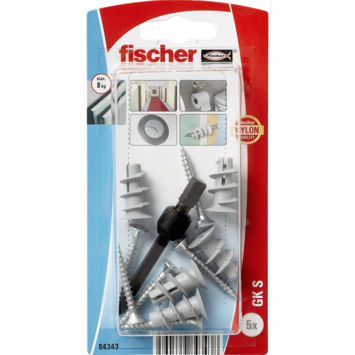 Fischer GK S gipsplaatplug met schroeven en hulpstuk 5 stuks zijn het snelste te monteren in gipsplaten. Handig voor het ophangen van je schilderij, klok, seriemontage en lampen. De gipsplaatplug is 22mm en de schroeven zijn 35mm en Ø4,5mm. Gebruik deze schroeven in combinatie met bitje PZ2. Geleverd als 5 gipsplaatpluggen inclusief hulpstuk van 40mm.