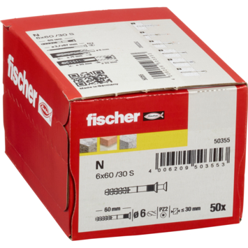 Deze Fischer-nagelplug N6x60Z gebruik je voor het monteren van houten regelwerk op verschillende materialen. Denk aan betonnen wanden, wandverbindingen en metalen profielen. Gebruik voor het boren van het gat waarin je de nagelplug aanbrengt, een boor met een diameter van 6mm. Vervolgens breng je de 60mm lange nagelplug aan en schroef je de schroef van 65mm met een diameter van 4mm erin. Na montage is deze nagelplug met een lengte van 6cm, afhankelijk van het materiaal waarin je de plug bevestigt, te belasten tot maximaal 20kg. Je koopt de Fischer-nagelplug N6x60Z per 50 nagelpluggen.
