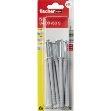 Fischer N 8x100/60 S slagplug met 8 stuks zijn van toepassing op verschillende soorten materialen zoals beton, wandverbinding en metaal. Maximaal te belasten tot 27 kg afhankelijk van het materiaal. Gebruik voor het boren van het gat een boor van Ø8mm. De plug is 100mm lang, en de schroef is 105mm en Ø5mm. Zeer geschikt voor het monteren van houten regelwerk. Geleverd als 8 slagpluggen.